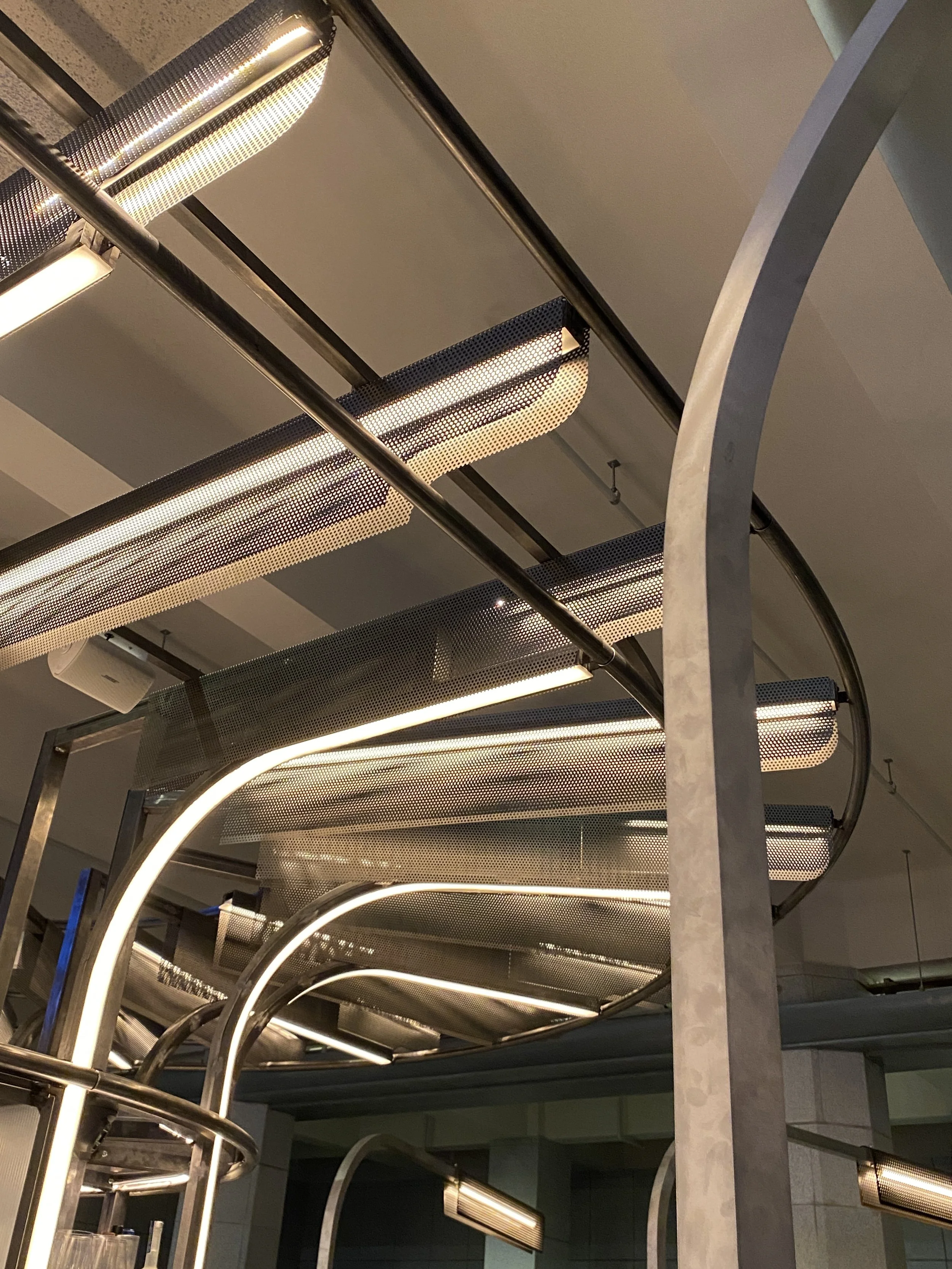 metal cabinetry and light fixtures to serve as the focal centrepiece for Control Room Bar at Battersea Power Station.